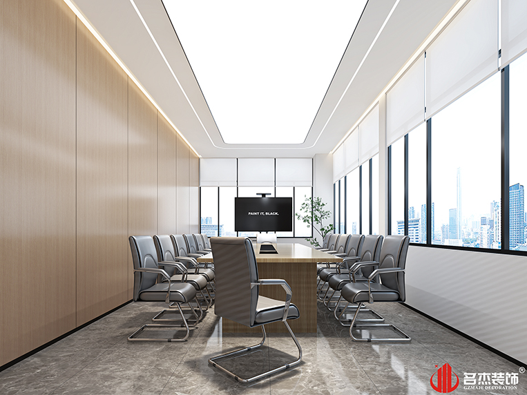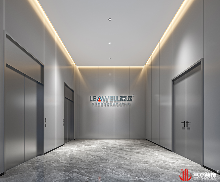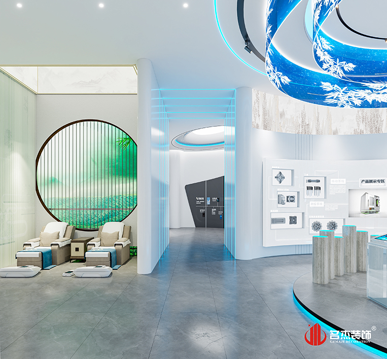 設計團隊在展廳區域使用具有科技元素的藍色,作為該空間的主導色,配合圓弧型的吊頂造型,讓空間具有科技感的同時,還能具有設計層次感。而且前臺區域的設計中,讓企業LOGO色作為空間的點綴色,使用在前臺桌子上,搭配造型感十足的吊頂,讓空間更具有設計層次感。#廣州辦公室裝修#