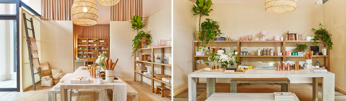 此間是生活方式品牌店的店鋪裝修,根據介紹此家店鋪是銷售一系列美容產品、家居用品和服裝。占地121平米,基本是用裝飾軟化空間,給人的感覺就是溫馨舒適,有許多桌子、植物和地毯。