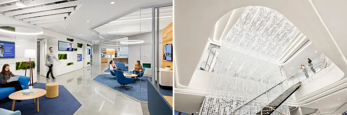 項(xiàng)目的設(shè)計(jì)遵循以一個(gè)大的設(shè)計(jì)原則,創(chuàng)建一個(gè)講科學(xué)、人和目的緊密連接的空間。這樣就能夠體現(xiàn)出水平和垂直連接的空間組織當(dāng)中,以一個(gè)促進(jìn)參與、分享和慶祝的社區(qū)中心。在活躍的社區(qū)中心設(shè)計(jì)有一道雕塑般的黑色鋼板樓梯,從14樓一直向下延伸到一個(gè)螺旋形的木質(zhì)基座上。螺旋形基座,即是樓梯踏步、也是階梯座,為非正式聚會(huì)和全體人員大會(huì)提供了便利。
