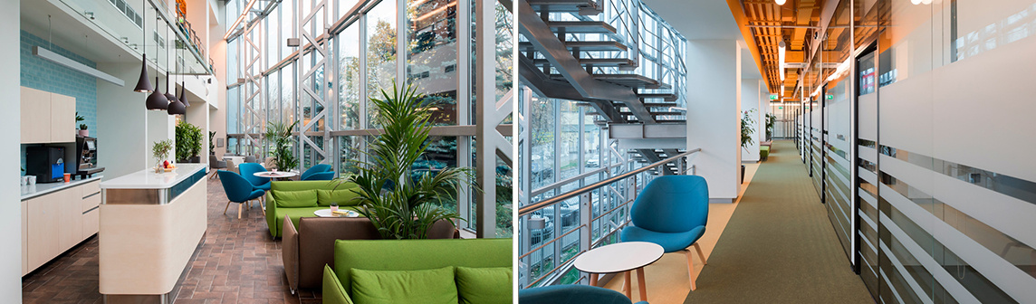辦公室的整體色調以自然色彩和紋理為基礎。金屬網格作為空間隔板。由于現有的中庭玻璃窗具有淺藍色調,因此在中庭通道中產生寒冷且略微不舒服的照明。為了解決這個問題,OFFCON決定在地板上鋪上赤陶土顏色的瓷磚,添加大量的熱帶植物,并將中庭附近的天花板漆成亮黃色。