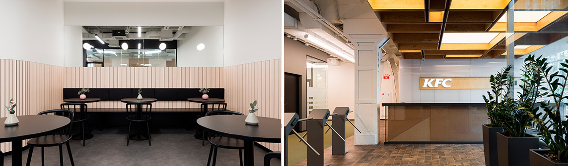 該公司在莫斯科一棟20世紀70年代的建筑中占據3層,在一樓的中庭創建了咖啡館,還有一個大型活動大廳,可以變成5個獨立的空間,4個會議室和一個廚房。沿著中庭立面的第二層和第三層通道被設計為休息區。還有一組會議室和封閉的辦公室,后面有一個開放的空間。開放空間變得安靜舒適; 從封閉的辦公室可以看到中庭和后面的街道。由于肯德基專注于食品行業,建筑師特別關注咖啡點和咖啡館,營造了一個舒適的充電環境。根據客戶的要求,辦公室里還有一個廚房實驗室,用于教學和測試。