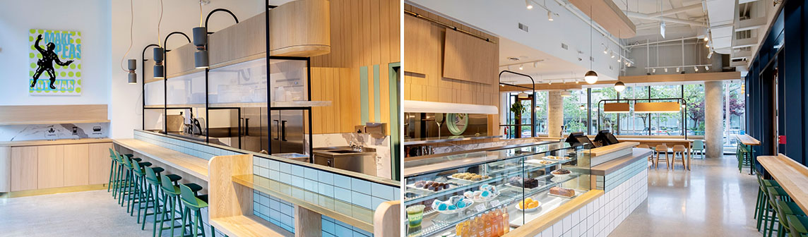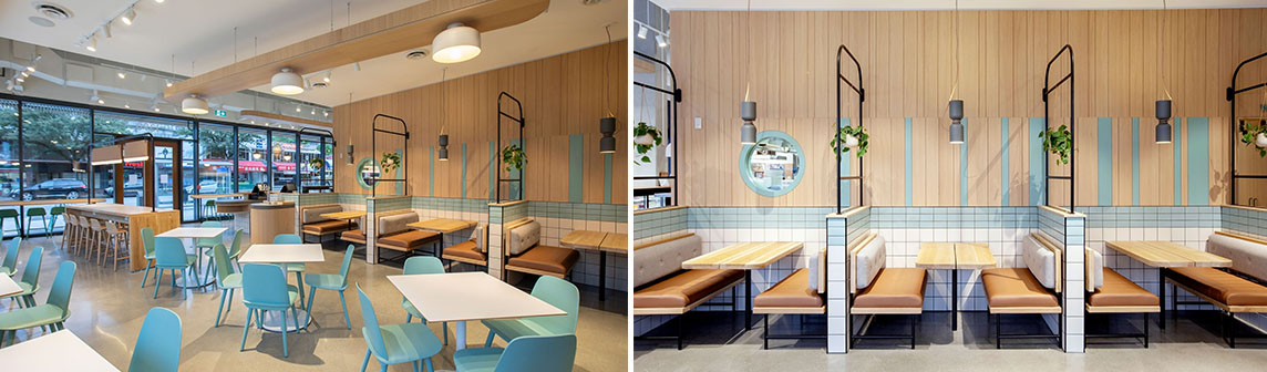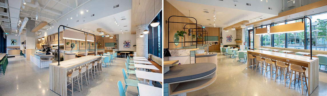 這是一家現(xiàn)代化的休閑餐廳裝修設(shè)計(jì),室內(nèi)設(shè)計(jì)的目的是創(chuàng)造一個(gè)多功能空間,以適應(yīng)一個(gè)黎明到傍晚休閑用餐的概念,并配有開放式廚房,咖啡廳和果汁吧。在角落,設(shè)計(jì)師利用了通高落地窗,沿著他們?cè)O(shè)置了休閑座位,為顧客提供了街道的景色,同時(shí)享受他們的飲料和食物。