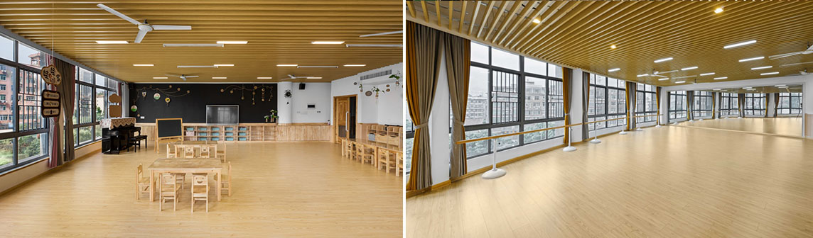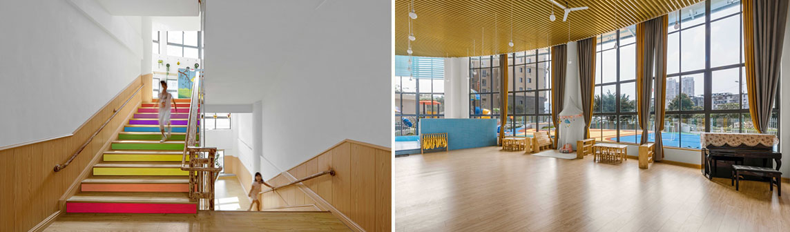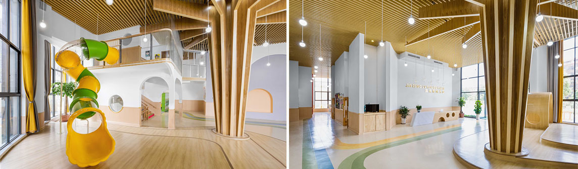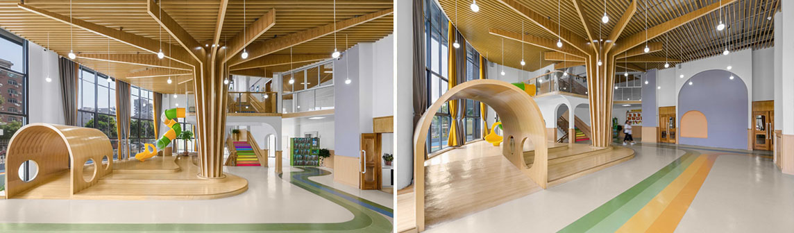 公共區: 項目改造前原建筑窗都是大落地窗,保證充沛的陽光,依靠空間的層高優勢,利用貫穿空間的大樓梯,劃分出更多可以用來發展兒童天性的自由探索空間,一樓接待大廳作為孩子們進去室內的第一空間,地面為PVC地塑材料,一條跑道將公共空間和教室連接起來。大廳保留原有的圓形柱子加以“樹”的抽象造型修飾原建筑柱體,室內空間主要以白色、木色為主,樓梯閣樓處挑出空間用平臺與滑梯連接一樓的活動空間,增加“樹”與“樹屋”的空間趣味性。用簡單樸實的設計向孩子們展示出設計者和教育者的可持續性環保理念。