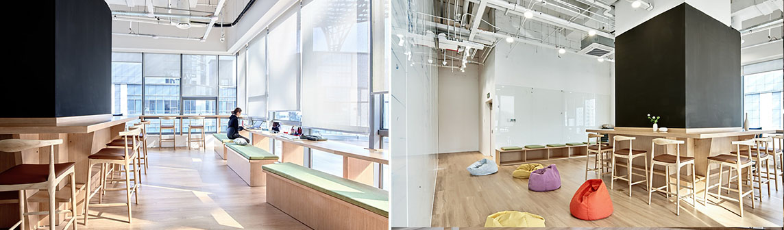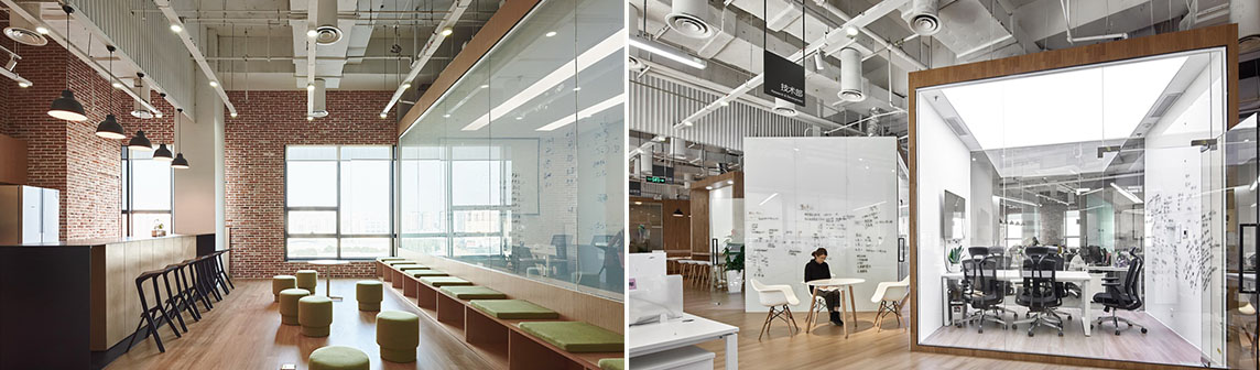 “盒”將主辦公區(qū)分為兩個部分,既不互相干擾,又互相滲透, 避免了開放式空間的單調(diào),創(chuàng)造了一個靈活、互動、高效的開放辦公場所。大會議室緊靠休息區(qū)域,電霧玻璃的使用使得在無會議時兩個空間產(chǎn)生貫通,而在會議進(jìn)行時又能保證隔離不被打擾。為了使有限的空間得到高效的利用,辦公室中提供了不同尺度多功能交流空間從而達(dá)到“合作共享”的可能。